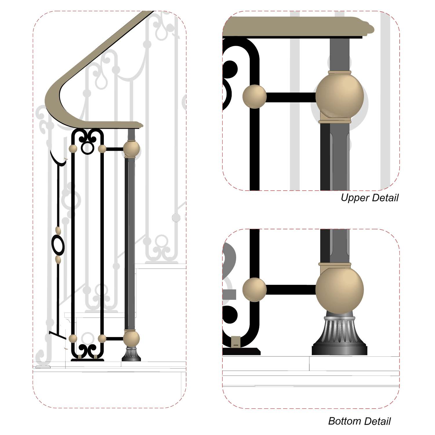 The stair railing, in particular, presented a dynamic interplay of form and materiality. Forged using traditional techniques, it showcased a seamless fusion of dark and ultra-light bronze patinas.
