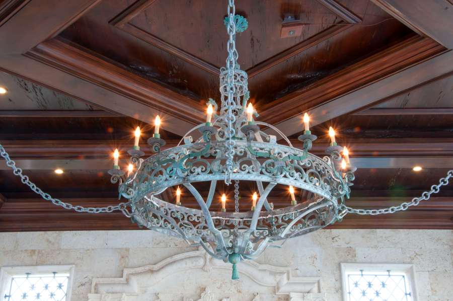 Hand-forged from solid bronze, this Mediterranean chandelier showcases masterful craftsmanship in its intricate scrollwork and balanced proportions. A naturally developed verdigris patina adds timeless character, contrasting beautifully with the warm candle-like lights. Suspended by robust chains, it becomes a focal point that blends old-world artistry with enduring elegance, bringing texture and history to the space.
