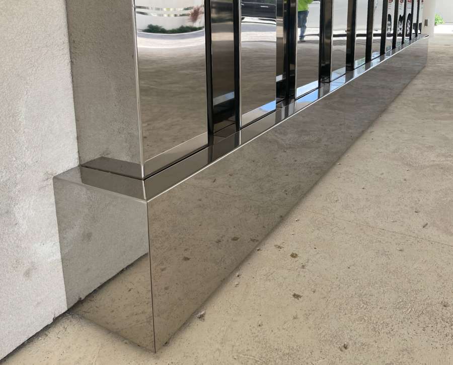 Mirror-polished stainless steel defines the entrance of a luxury Grand Cayman development, capturing the shifting light of sea and sky. Precision-fabricated panels create a seamless, sculptural façade where architecture meets the ocean’s rhythm, offering residents and visitors a luminous welcome that speaks to both modern elegance and coastal allure.