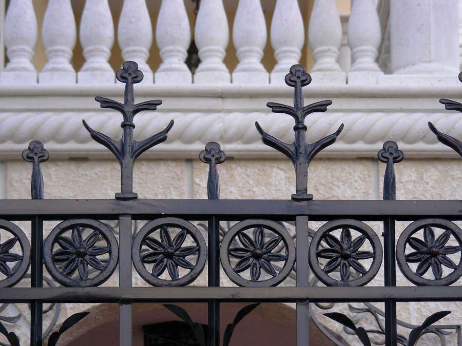 Aluminum construction combines forged and cast floral and leaf motifs to create a fence of timeless character. The deep black finish stands in striking contrast to the white stone architecture, highlighting both forms. Designed for elegance and durability, it frames the surrounding gardens while complementing the property’s classic architectural details.