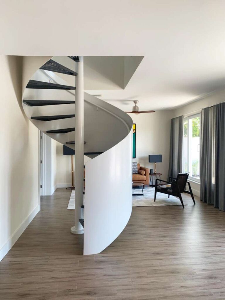 Within a minimalist interior, an aluminum spiral staircase unfolds in perfect radial symmetry, echoing the harmony of sacred geometry. Precision-cut treads form a rhythmic pattern that guides the eye upward, while the central column anchors the composition with sculptural clarity. The design blends mathematical proportion with contemporary aesthetics, creating a functional centerpiece that feels both […]
